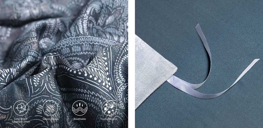 Absolutely love this duvet!! I looked for days and just couldn’t find the one until I ran across this! The colors are beautiful and the material is soft and kinda silky. Duvet has ties to help hold it in place along with hidden button closure. Set also came with 2 shams that match the duvet and came nicely packaged! I couldn’t be more happier with my purchase.