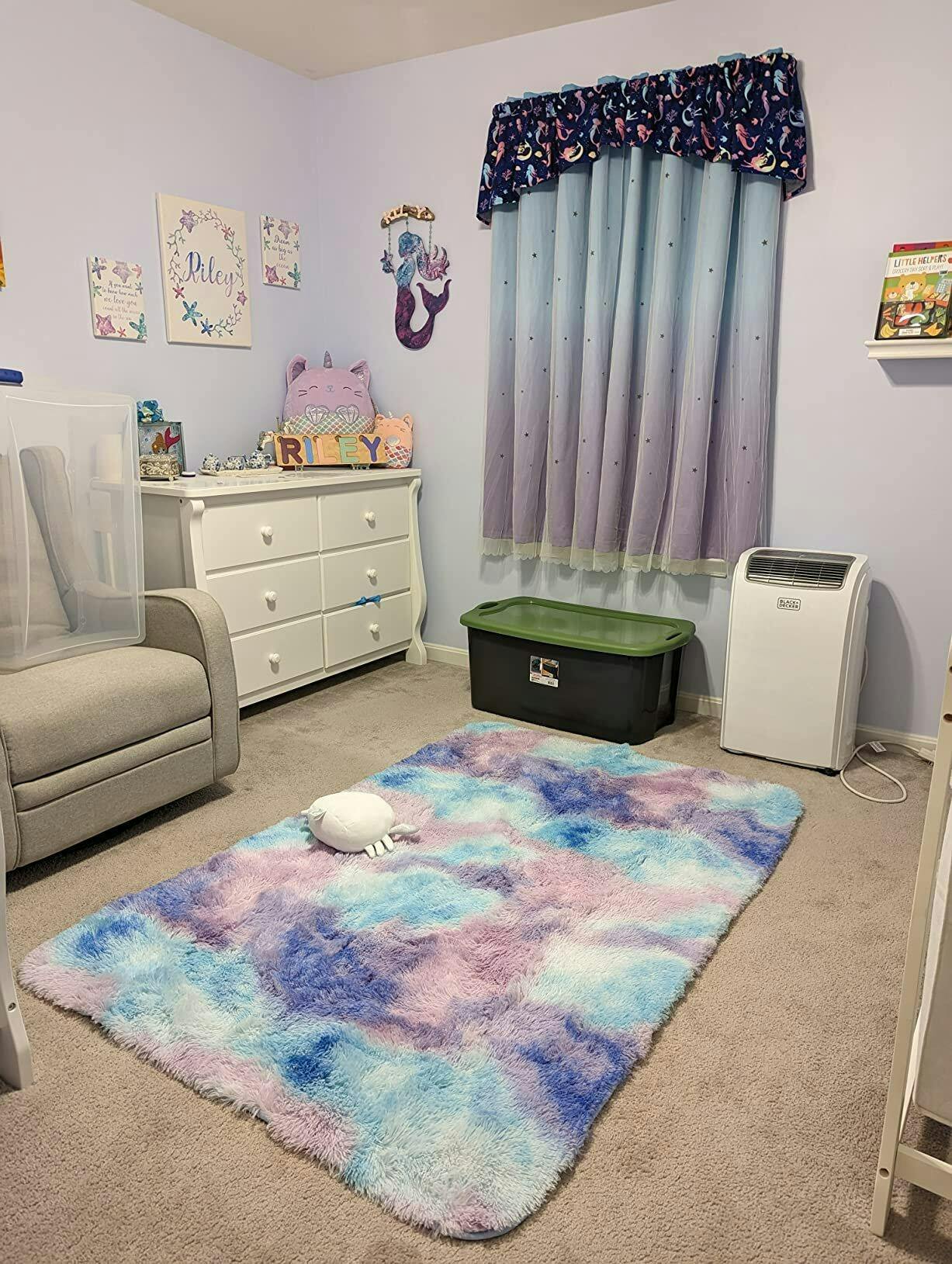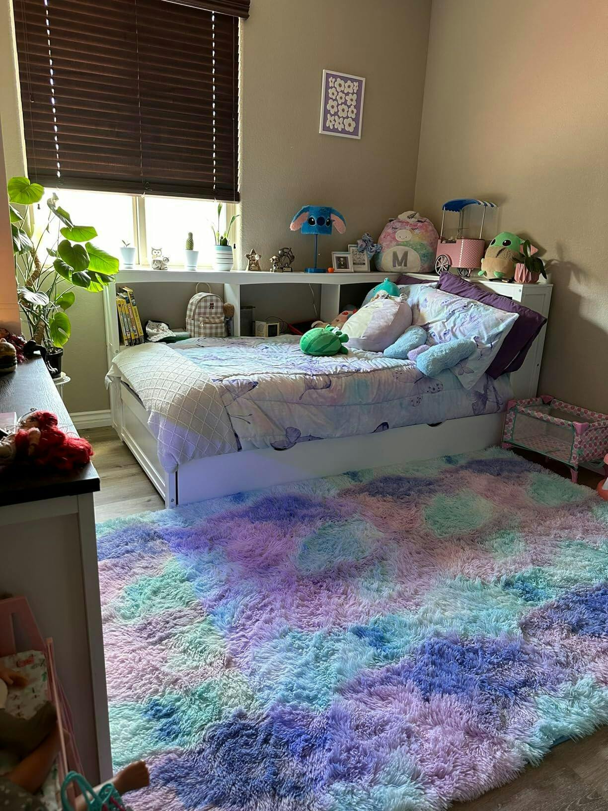 My daughter’s room has the rainbow theme going already. This rug was a very nice addition to her room. We are working on putting some new pictures up to complete the look. Keeps my daughter’s feet warm in the morning on the hard wood floors. She loved laying and playing on it.
