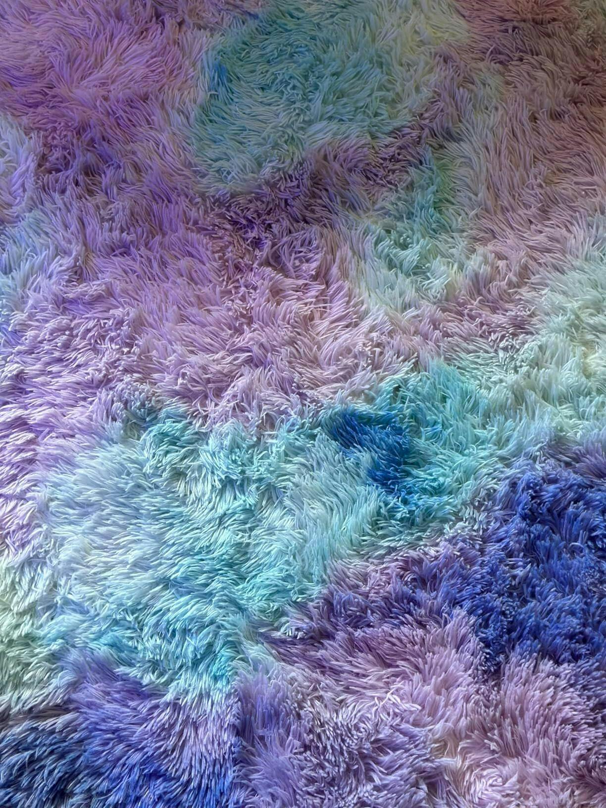 We love this super soft shag rug! This rug’s colors are vibrant and it has a grip at the bottom to keep it from moving around. I’ve added photos of it in both natural and warm lighting. Not quite sure how we will clean it yet as we haven’t had the need to.