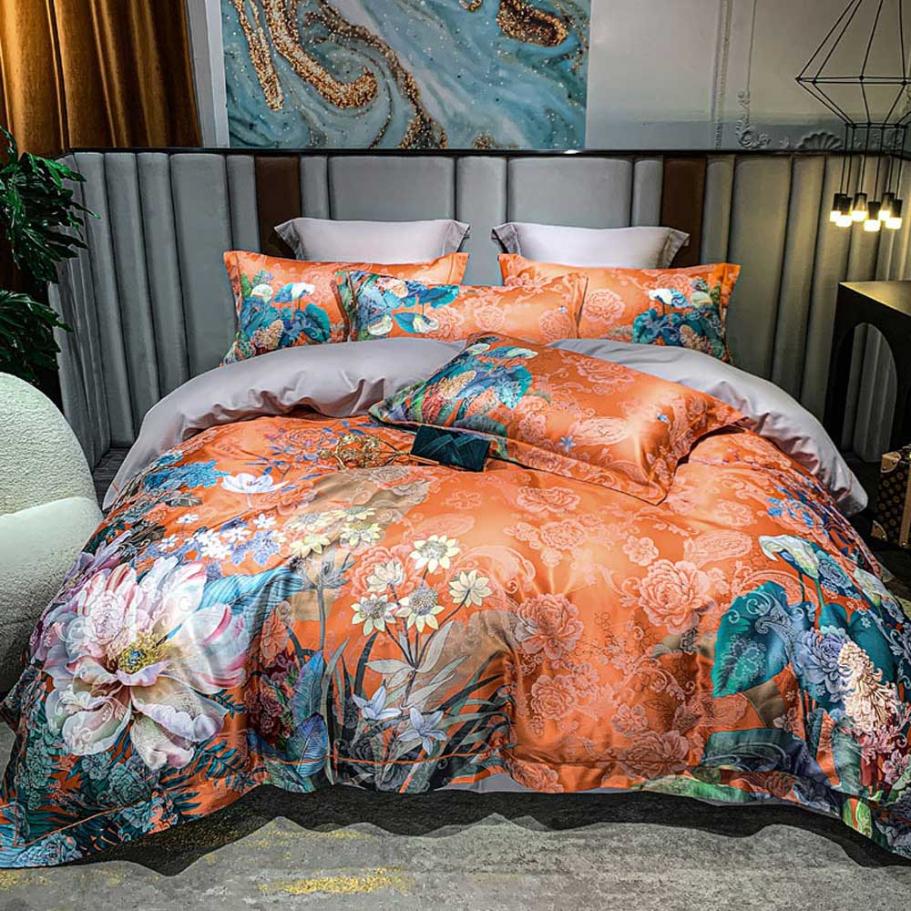 This duvet cover set is crafted with luxurious tribute satin, featuring intricate and delicate patterns with vibrant and lustrous colors, creating a distinct layering effect. It will bring a sense of comfort and indulgence to your bedroom, making it a haven of relaxation and luxury.