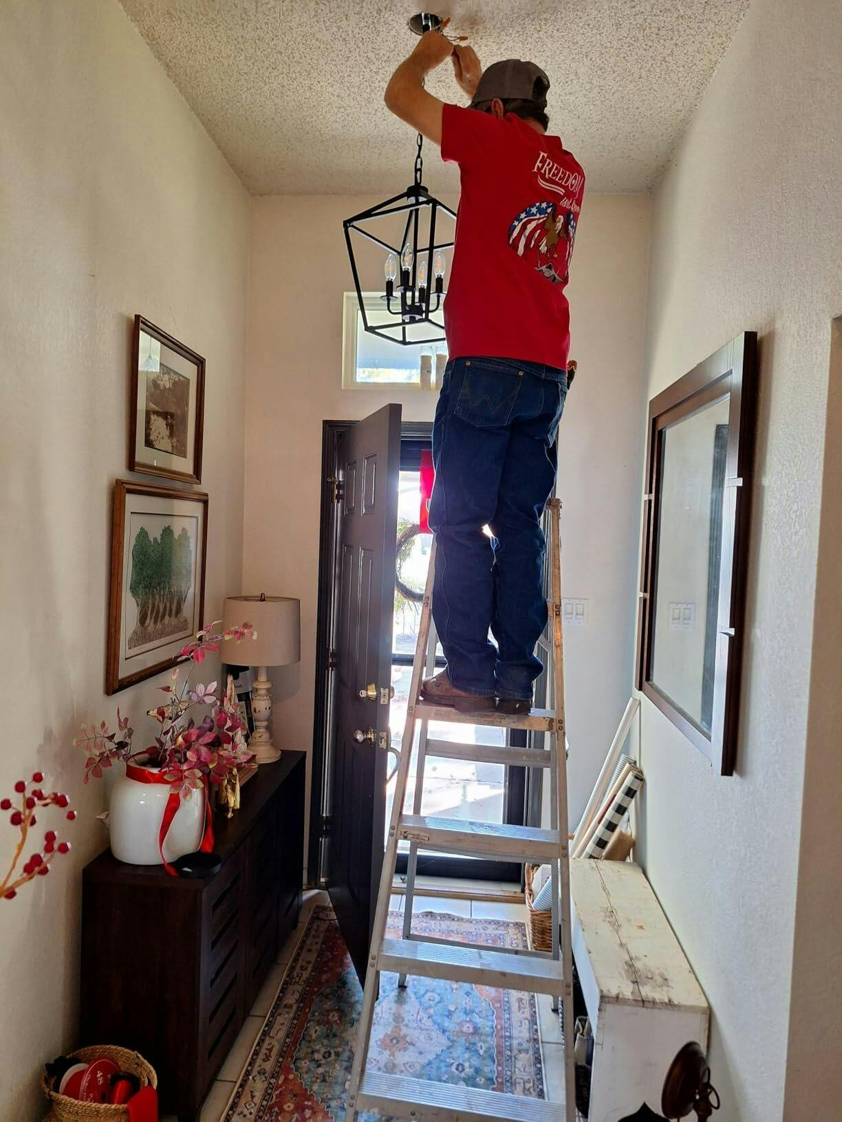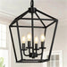 This geometric farmhouse lantern chandelier features a black candlestick-style center and a clean, open-frame silhouette that brings rustic character with a modern edge. Crafted from durable powder-coated metal, it offers long-lasting performance and easy maintenance. The adjustable chain allows flexible hanging heights, making it ideal for dining areas, kitchen islands, living rooms, hallways, and other indoor spaces.