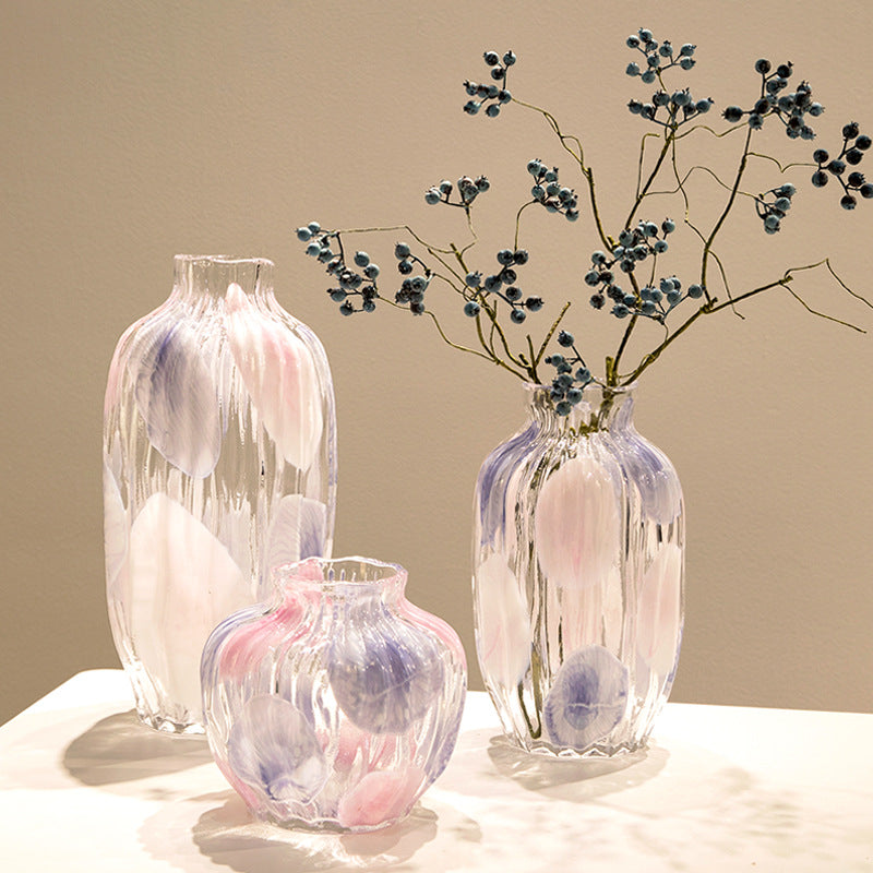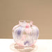 Crafted from hand-blown glass, this Italian-style vase features a vivid interplay of colors, stripes, and polka dots that shimmer with an iridescent glow. Its smooth, jade-like texture and fluid form bring a touch of artistic elegance and pastoral charm to any space—perfect as both a decorative accent or floral display piece.
