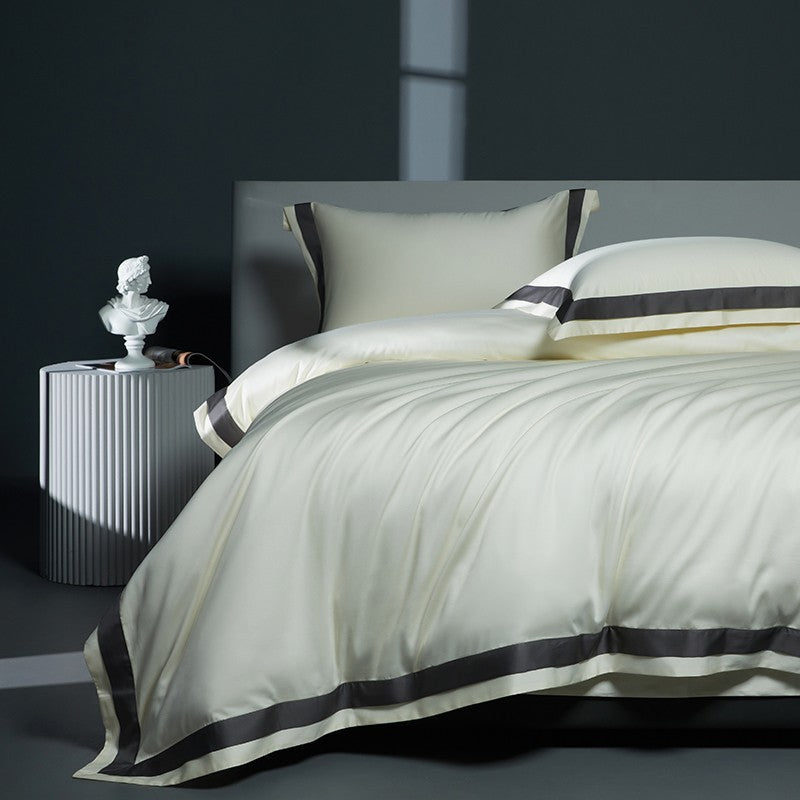 Indulge in refined comfort with this luxury 4-piece bedding set, crafted from 100S Egyptian long-staple cotton for a silky-soft, breathable sleep experience. The set features delicate embroidery and decorative woven trim, adding an elegant touch that transforms your bedroom into a serene, high-end retreat.