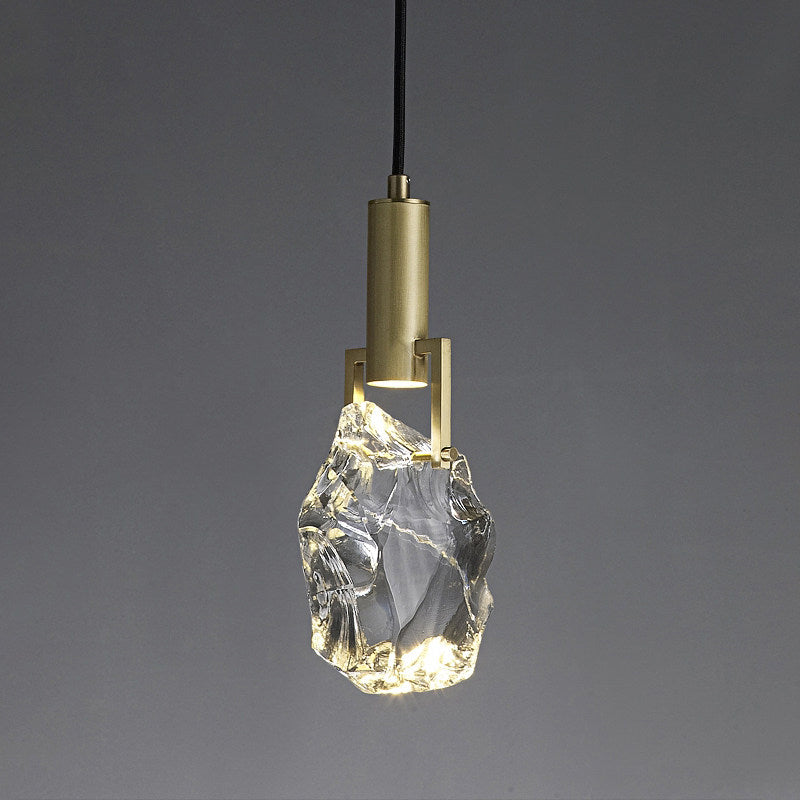 Inspired by the raw beauty of icebergs, this crystal mini pendant light blends hand-cut crystal with refined brass detailing. Each crystal piece is individually hand-hammered, creating organic, irregular textures that make every lamp truly one of a kind. Suspended by a line cable, it delivers a light, floating visual effect—ideal for modern, luxury interiors.