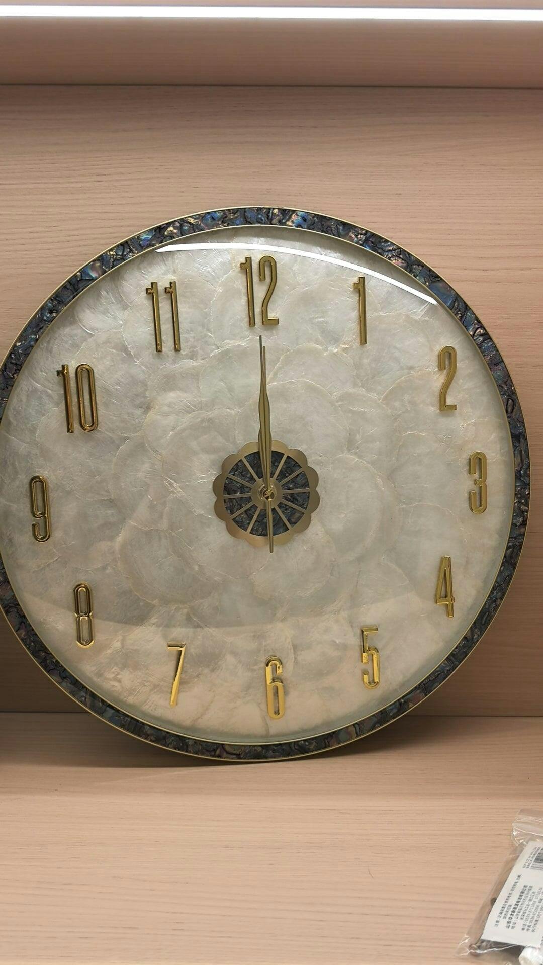 Our exquisite wall clock is crafted with a natural New Zealand deep-sea shell panel and complemented by a golden alloy frame. This luxurious timepiece features a super-silent movement mechanism, ensuring a serene environment in your home or office.