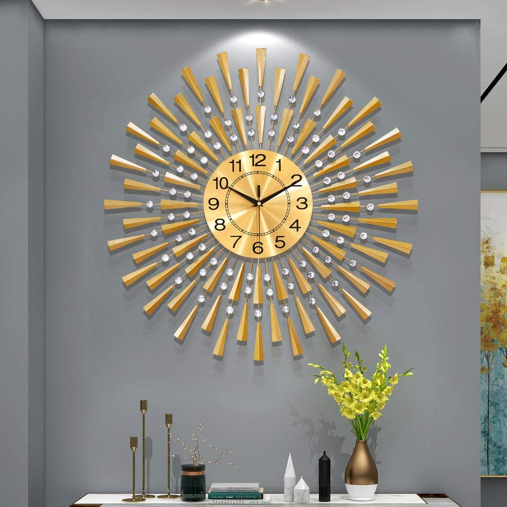 Handmade metal triangle shape round wall clock, made of durable metal with high temperature lacquer, 72 pieces crystal and aluminum gold clock face. It's great artwork.