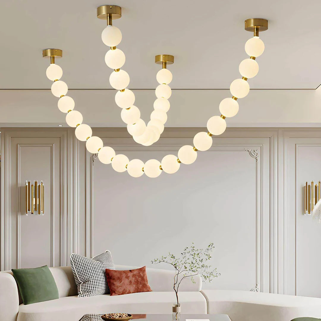 This chandelier blends timeless elegance with modern luxury, featuring smooth acrylic globes and sleek brass joints. It creates an art deco ambiance with soft LED lighting, perfect for any kitchen or dining area.