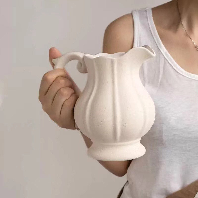 This handcrafted ceramic vase features a beautifully textured and curved design, adding a vintage-inspired charm to your home decor. This versatile piece blends seamlessly into rustic, farmhouse, or minimalist interiors, perfect as a decorative water jug or as a statement vase for floral arrangements.